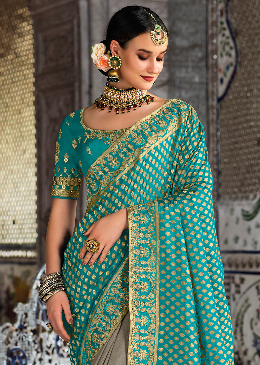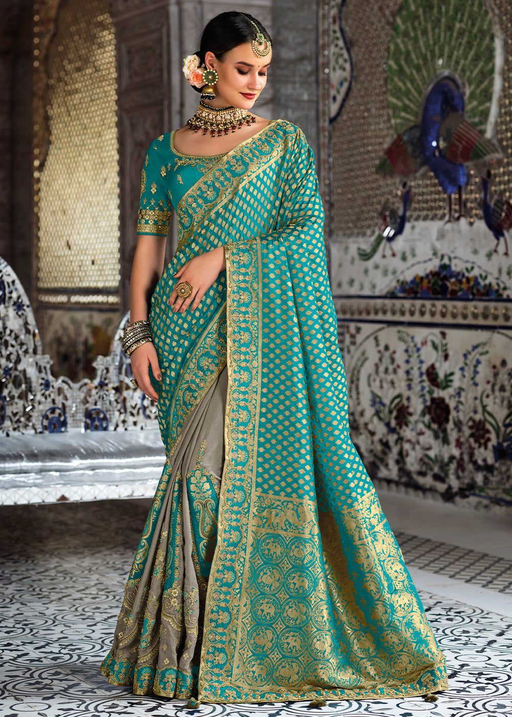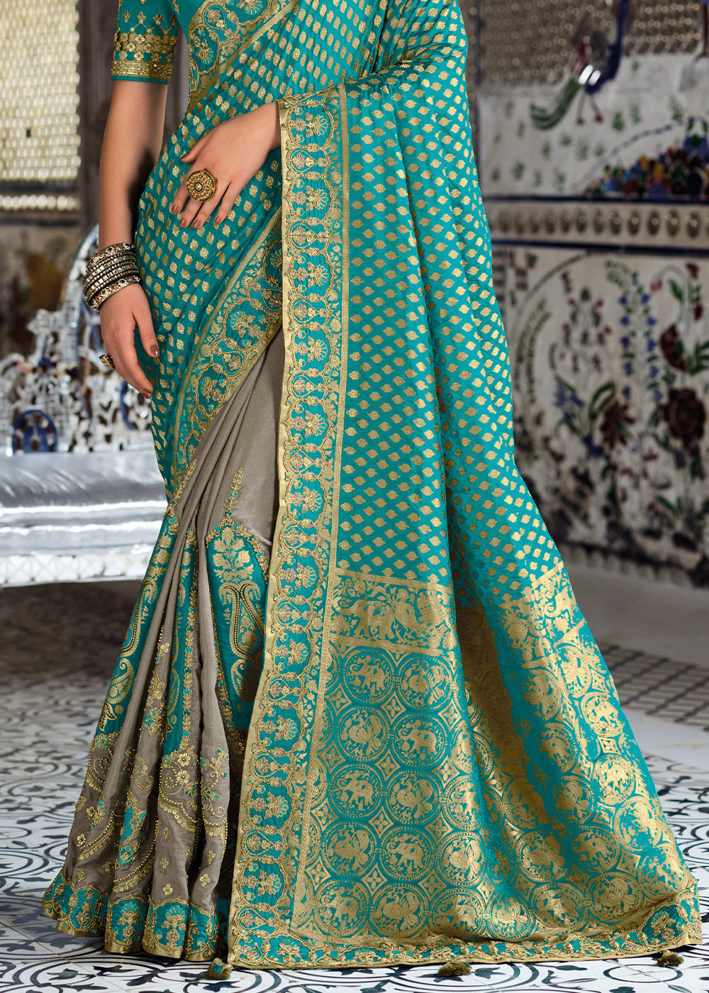 Grey & Blue Half N Half Banarasi Silk Saree with Embroidered work