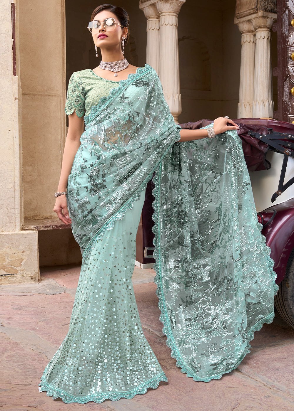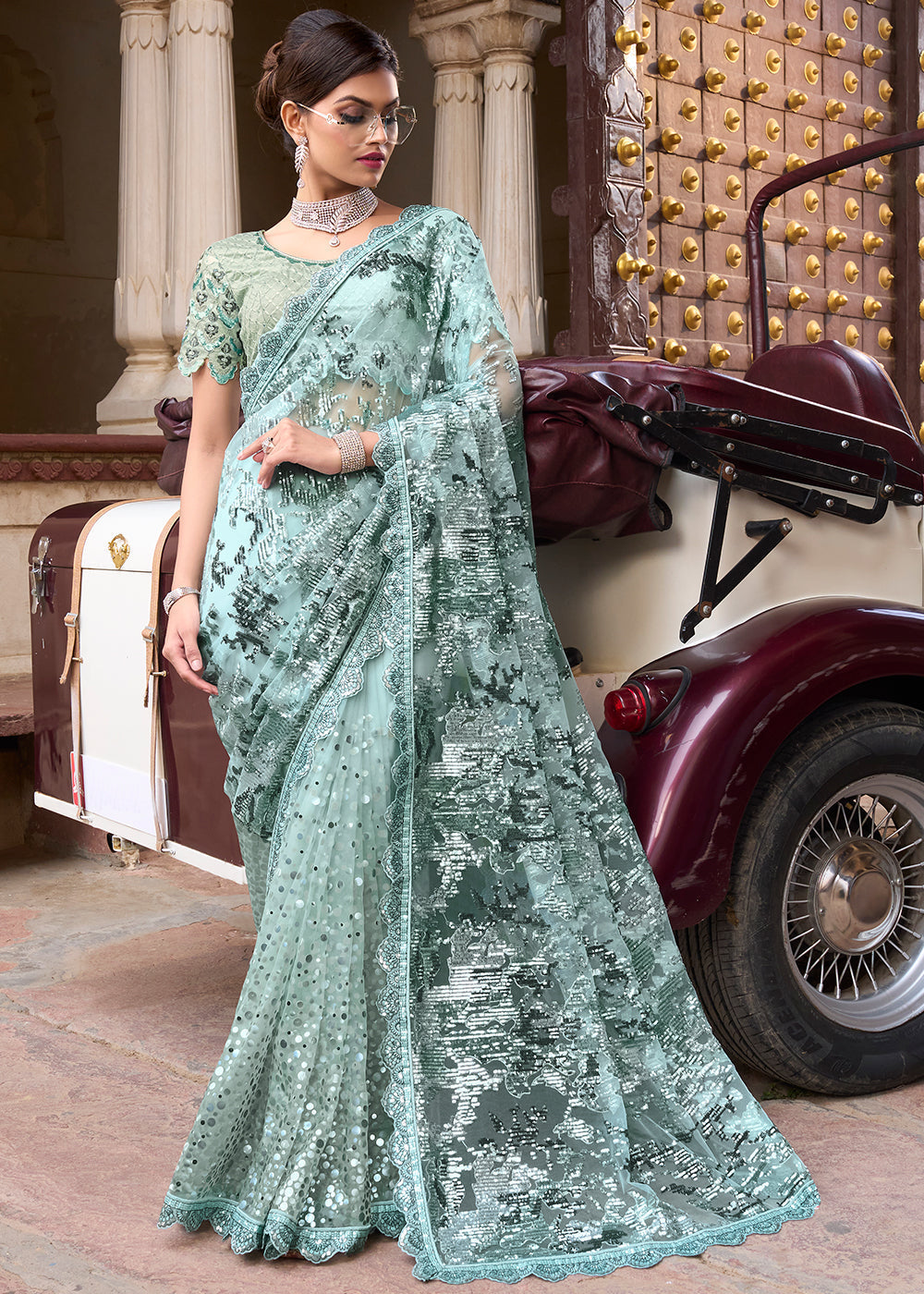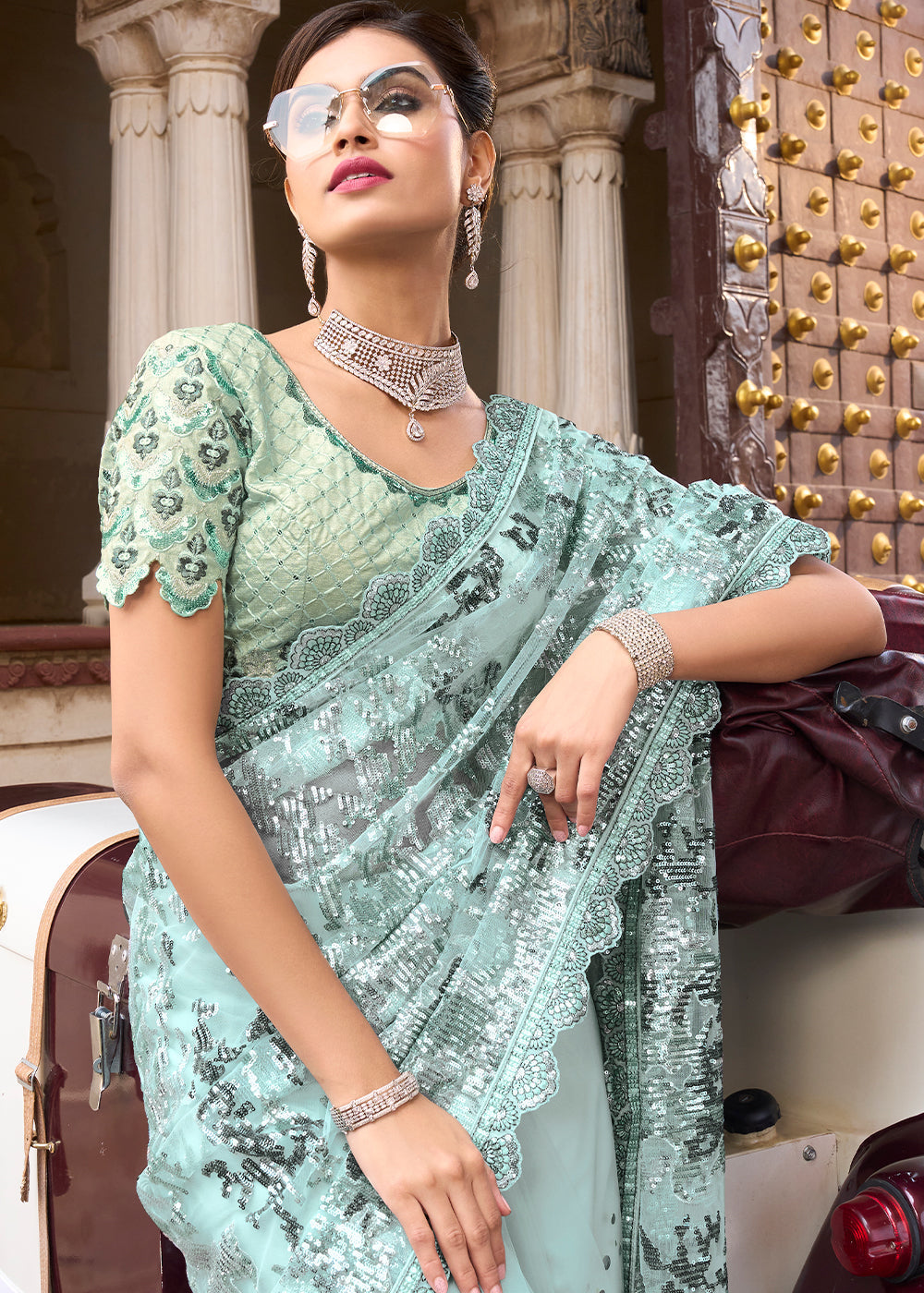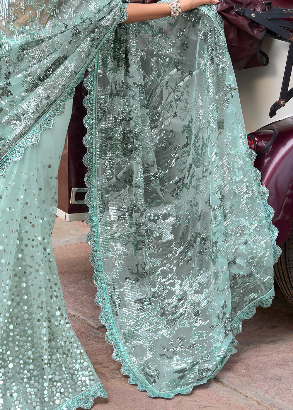 Light Sea Green Digital Net Saree with Sequins Pallu, Mirror & Foil work