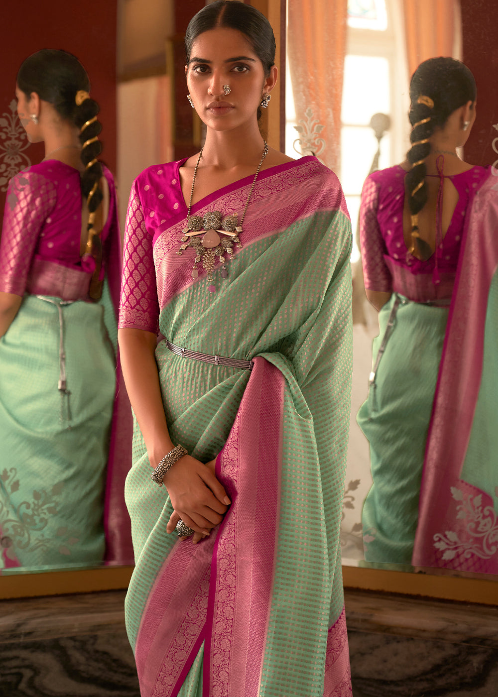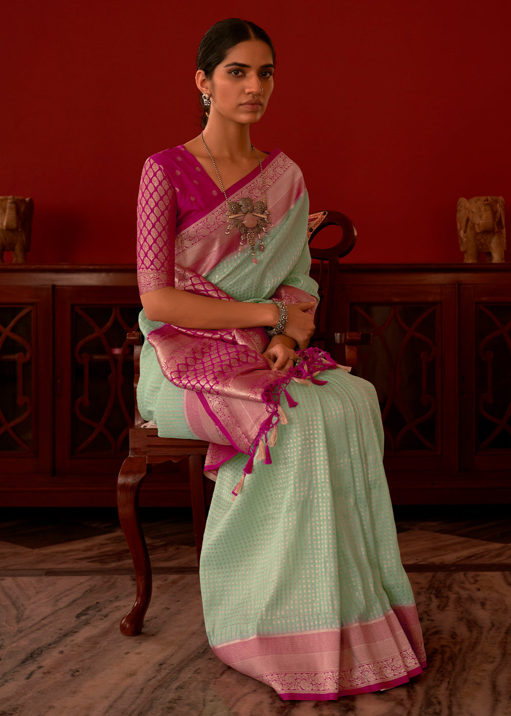 Pastel Green Zari Woven Georgette Saree with Contrast Border & Blouse
