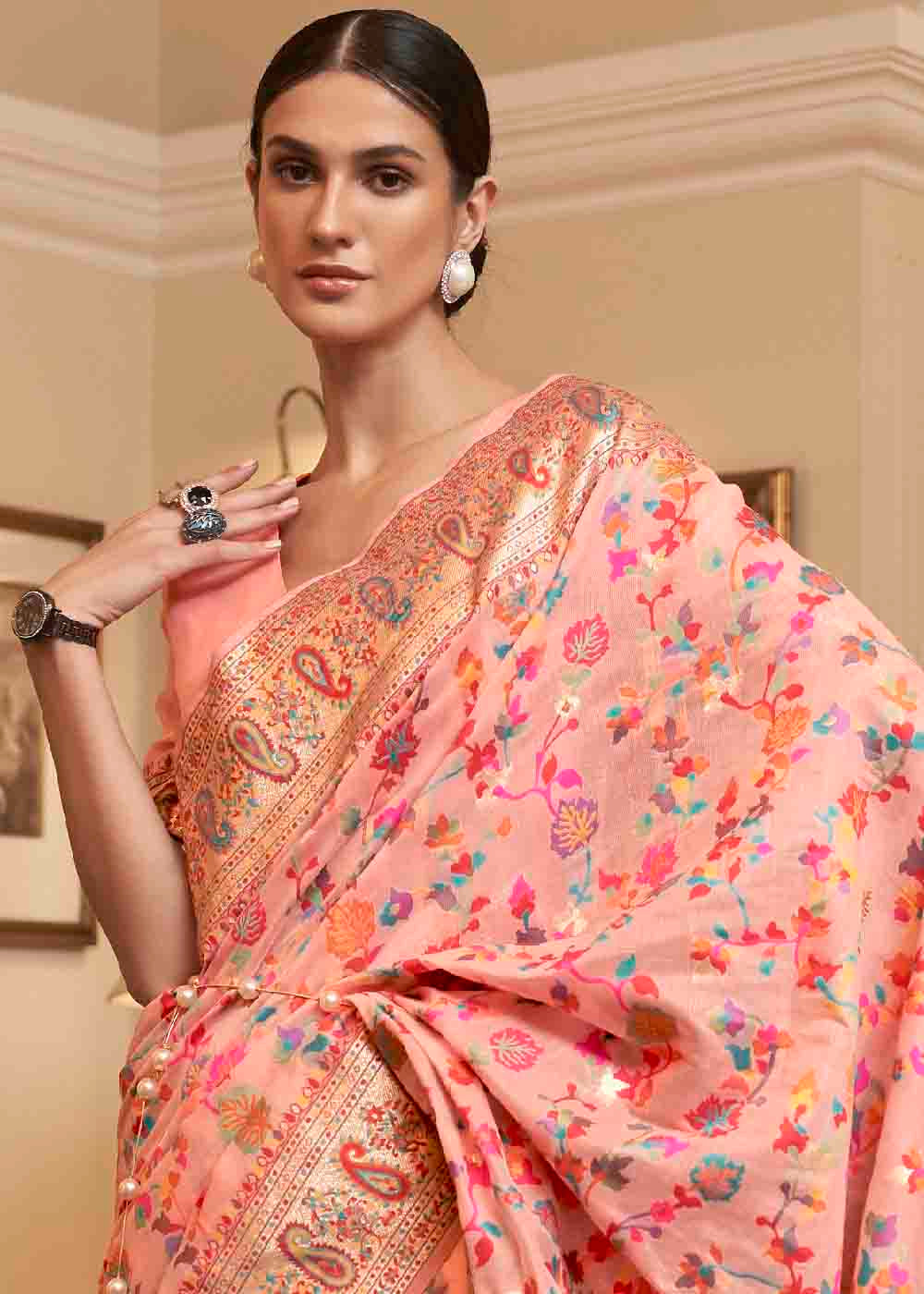 A celebration of Indian weaving art and featuring an assorted ensemble of Paisley motifs, this Peach Pink Banarasi Jamawar Woven Silk Saree is a sartorial bliss. With an intricate small floral design, this piece celebrates the expert craftsmanship of our weavers. A beautiful piece of heritage from the holy ghats of Banaras!
