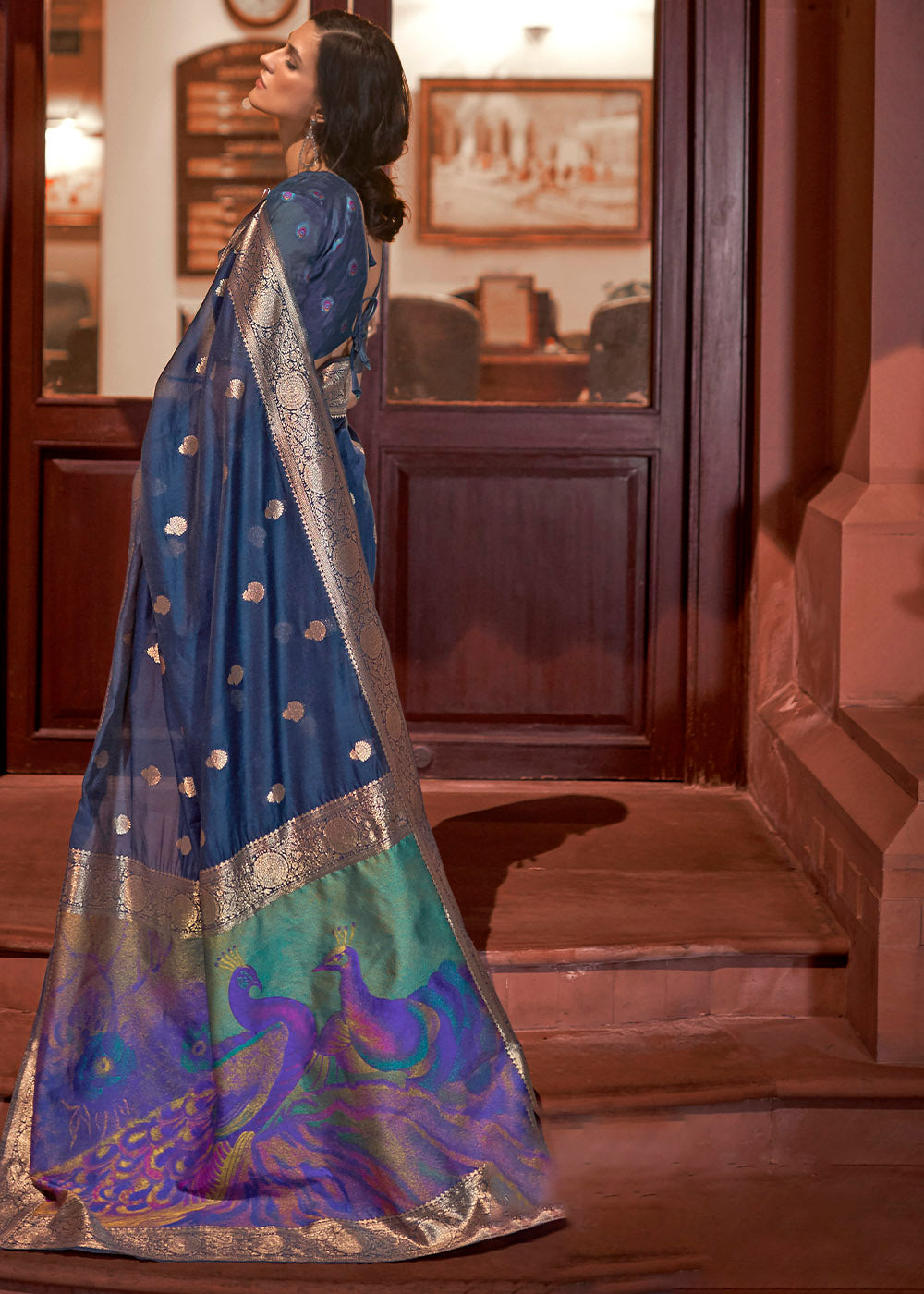 Space Blue Woven Chanderi Banarasi Fusion Silk Saree