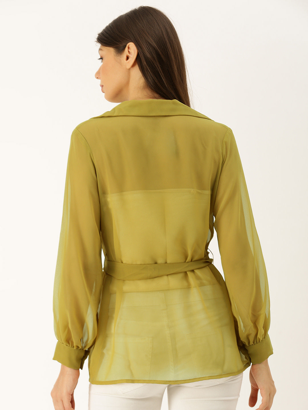 Look absolutely stunning and spruce up your casual wardrobe with this sheer blouse. It is a georgette waist length top. Due to its sheer fabric a matching or black inner can be worn underneath. Dress it up for an early lunch or a great Sunday outing. Pair it with black or navy jeggings and peep toe heels for a perfect chic look.