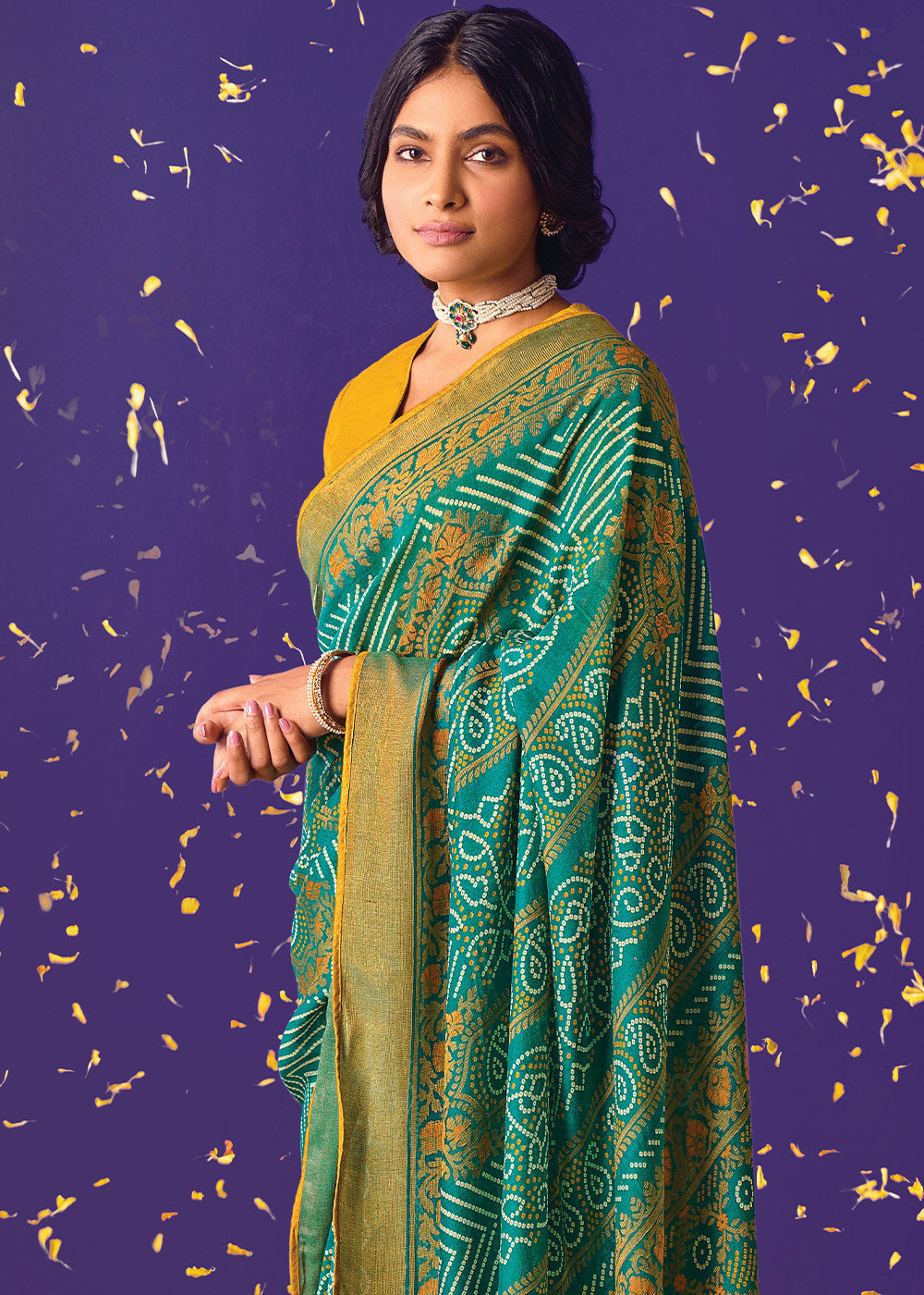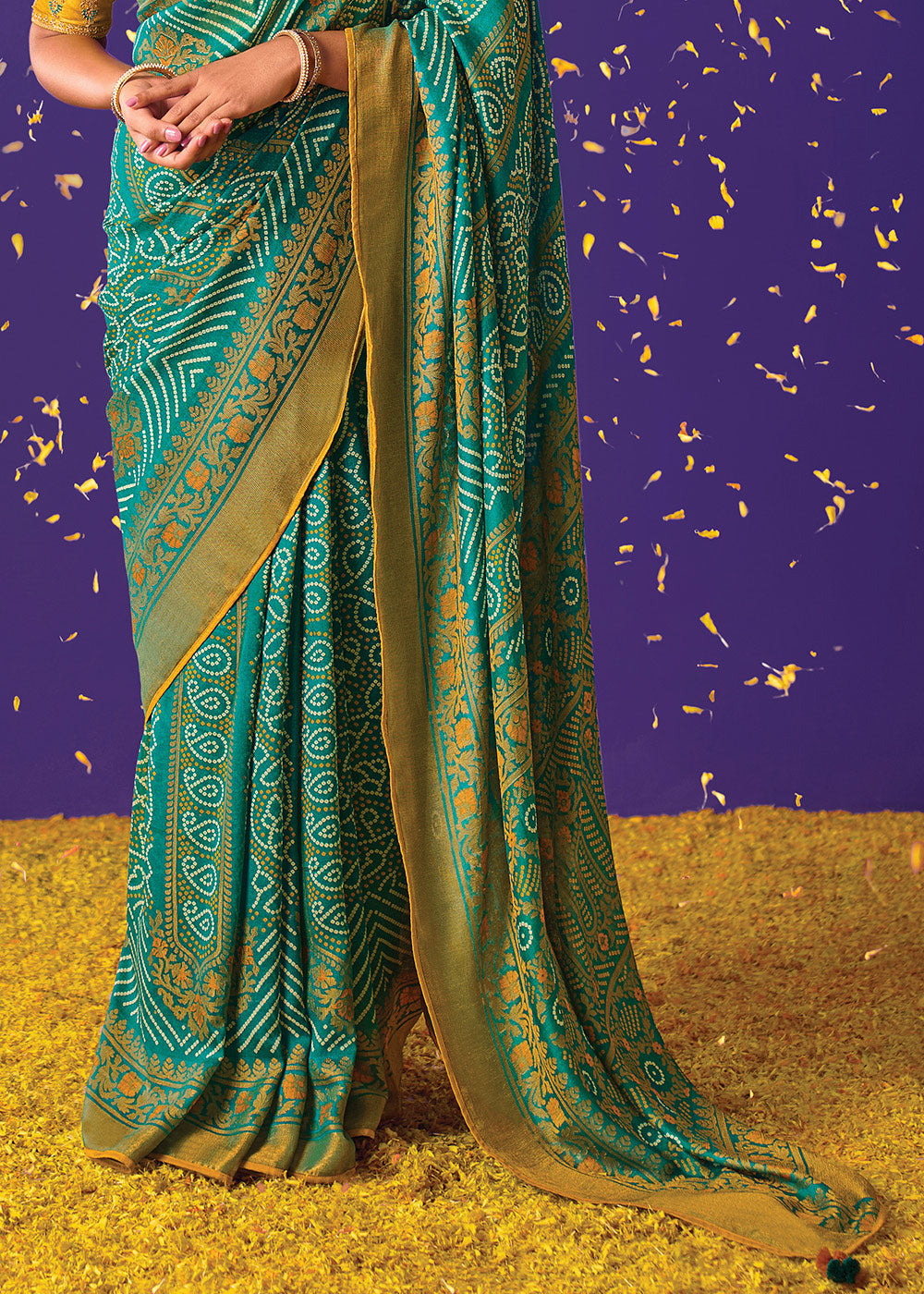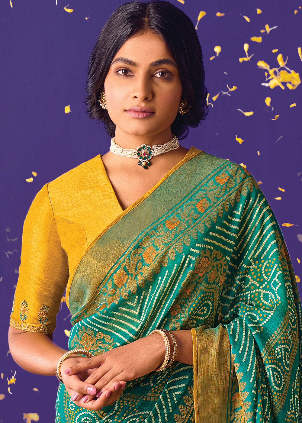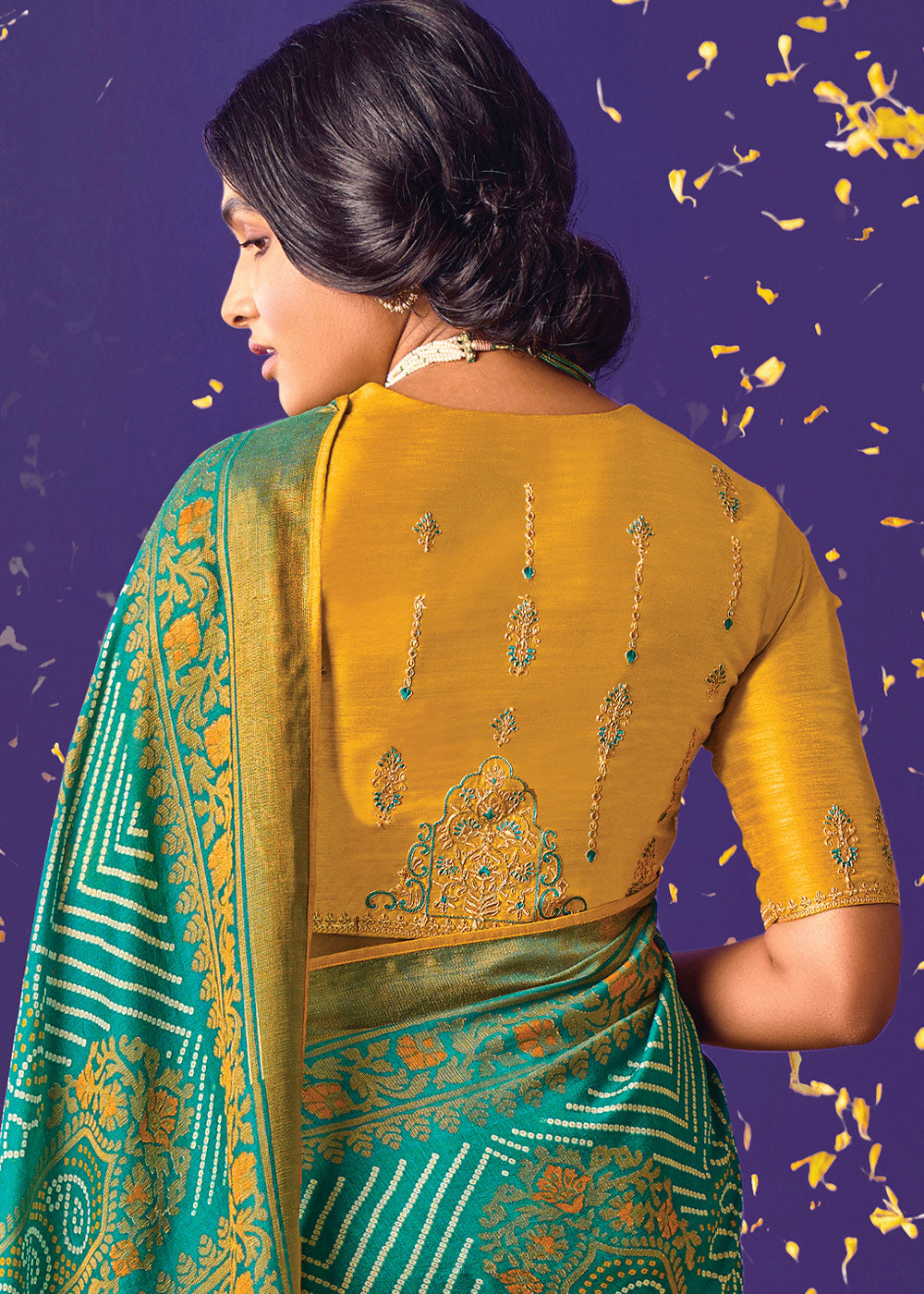 Teal Blue Printed Silk Saree with Embroidered Blouse
