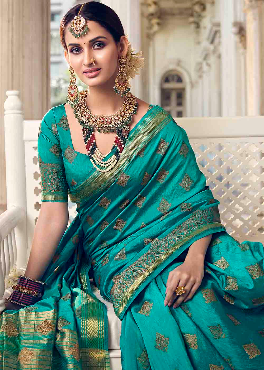 Settle for nothing but the best, stylish, and most elegant attire with this soothing Teal Green Floral Zari Woven Raw Silk Saree. Extremely light and easy to carry, Raw silk sarees offer simplicity in draping and ease of carrying. This piece, with an array of floral magic, comes paired with a contrast Border & Pallu in green.