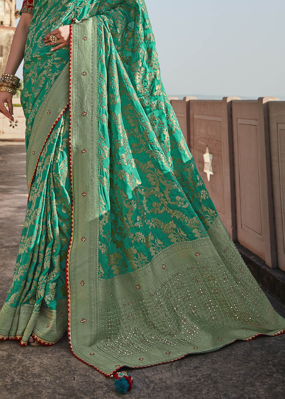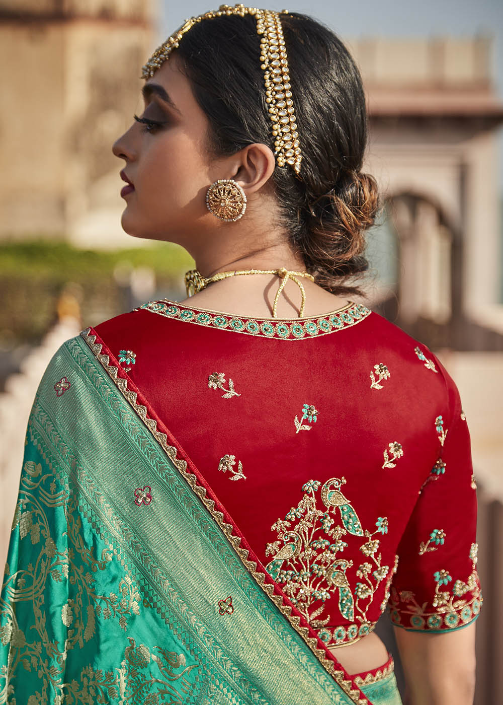 With the touch of pleasant hues that exude simplistic grace, this Teal Green Woven Banarasi Silk Saree with a splash of lively motifs is the perfect ethnic wear that ensures comfort and aristocracy. Paired with a delightful embroidered blouse and ideal for your grand affairs, this saree is a perfect companion to turn heads with confidence.
