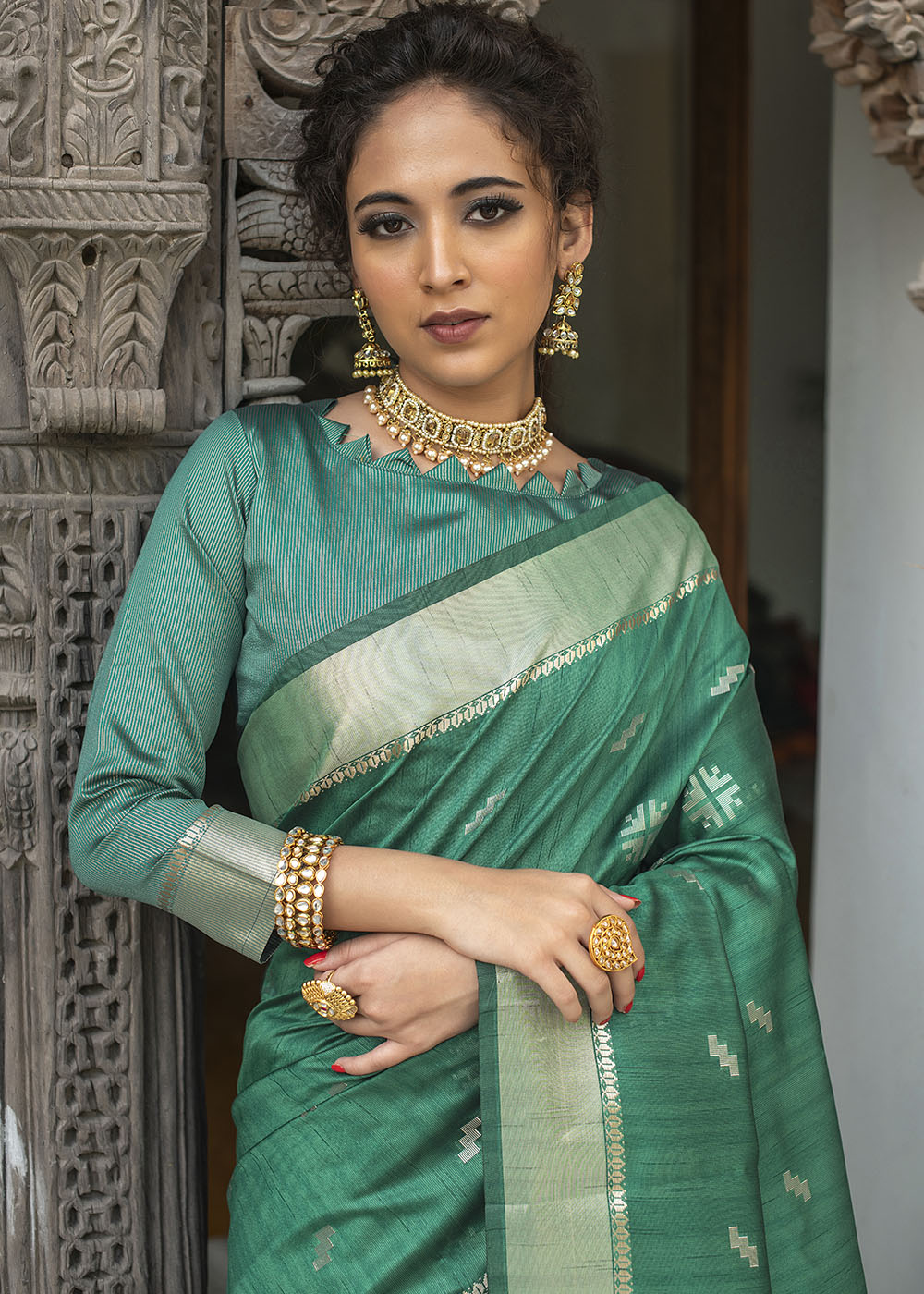 Make the heads flip and slay in style by choosing this exotic Teal Green Zari Woven Tussar Silk Saree. Enriched in sober hues with a lovely zari border and delicate motifs, this dazzling saree is a perfect solution to all outfit problems and a unique charm that captures the spirit of this delightful season.