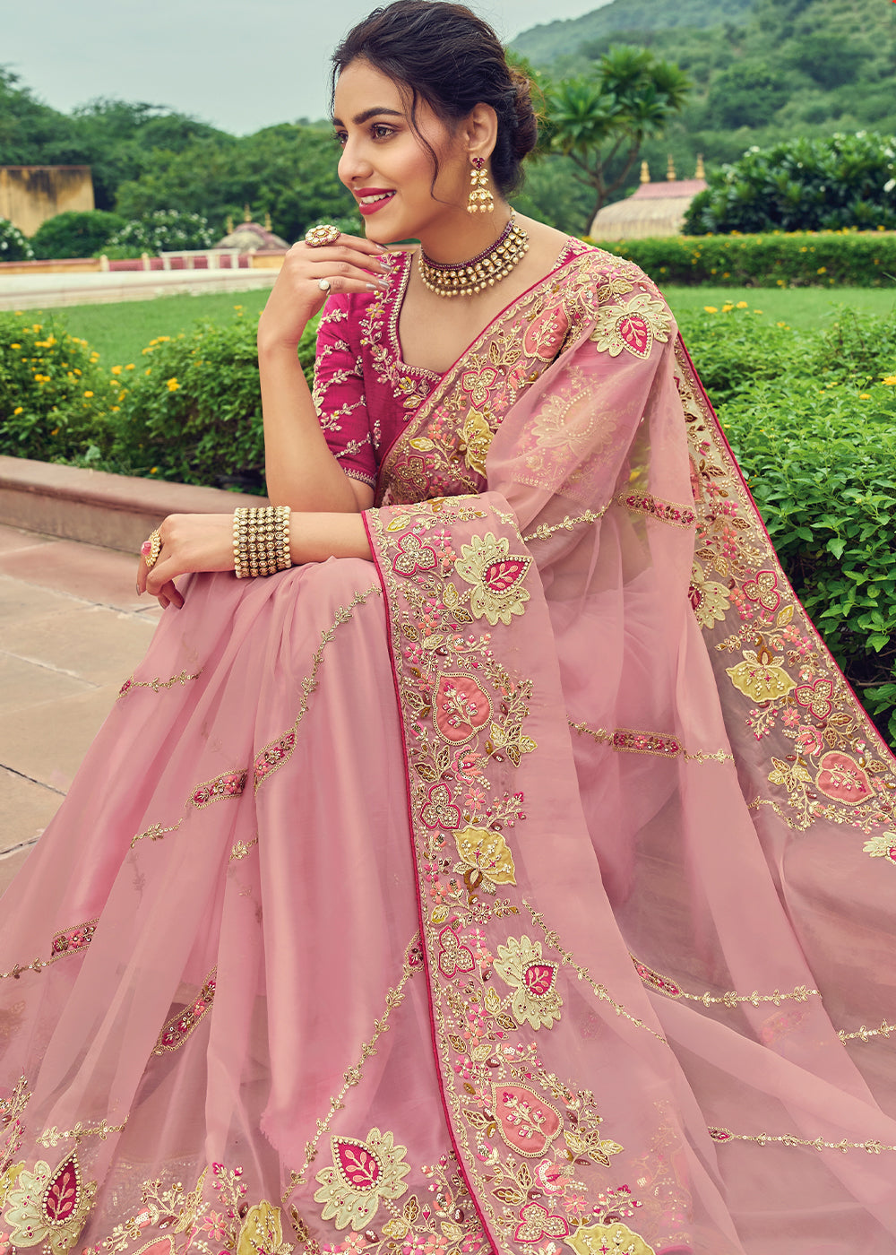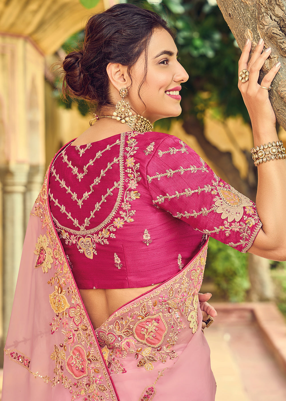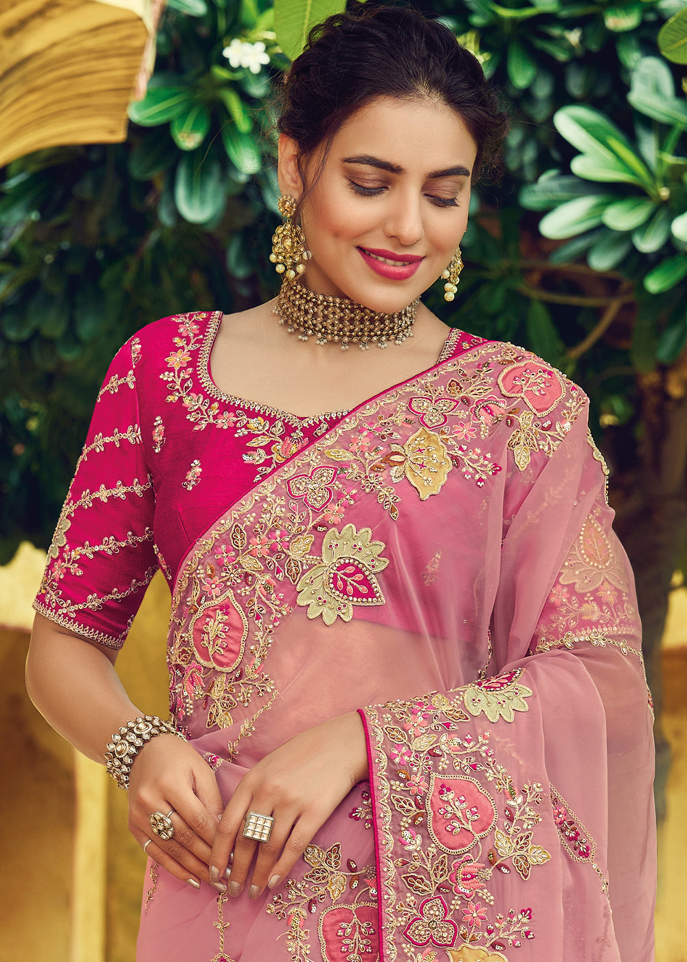 Thulian Pink Designer Organza Saree with Intricate Embroidery work