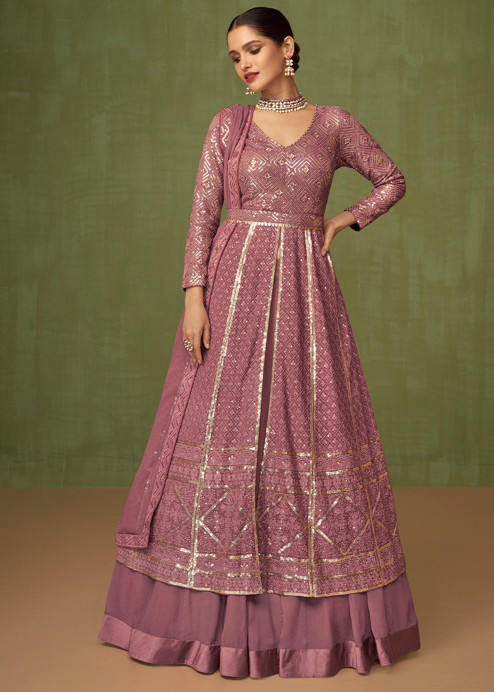 Thulian Pink Georgette Front Slit Cut Lehenga Suit with Embroidery work