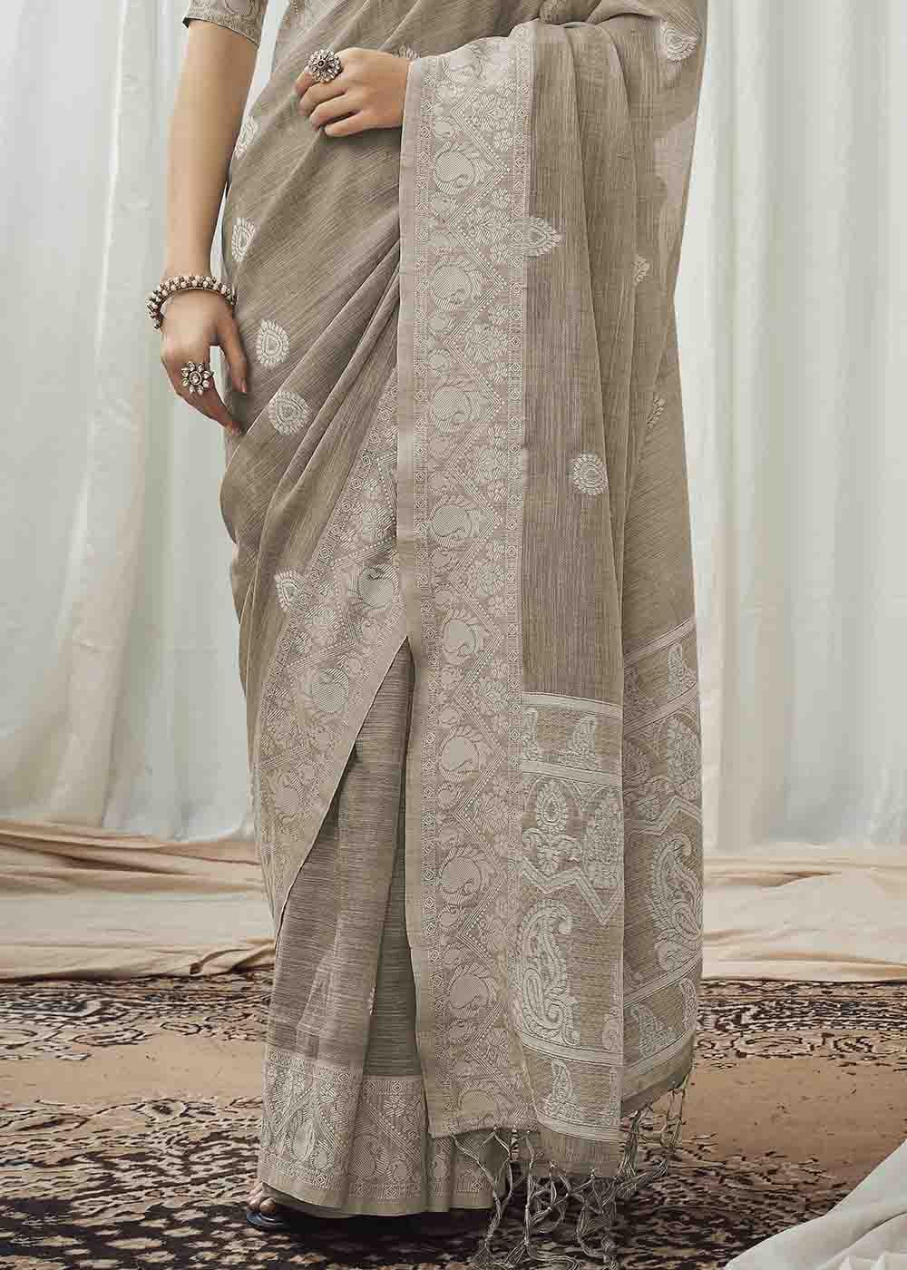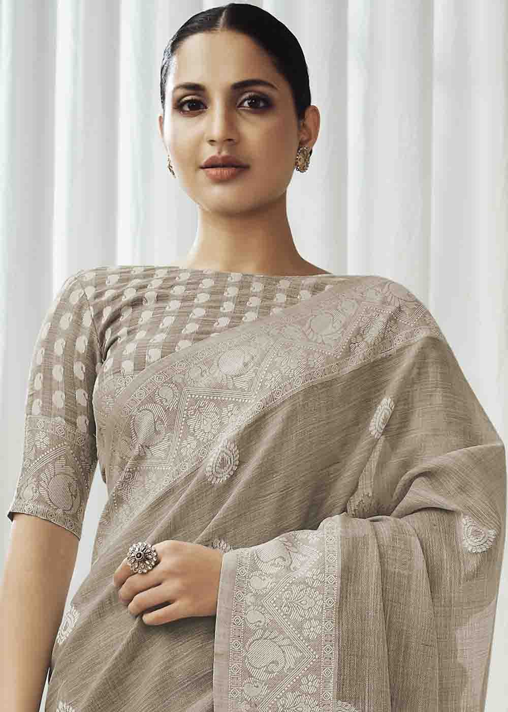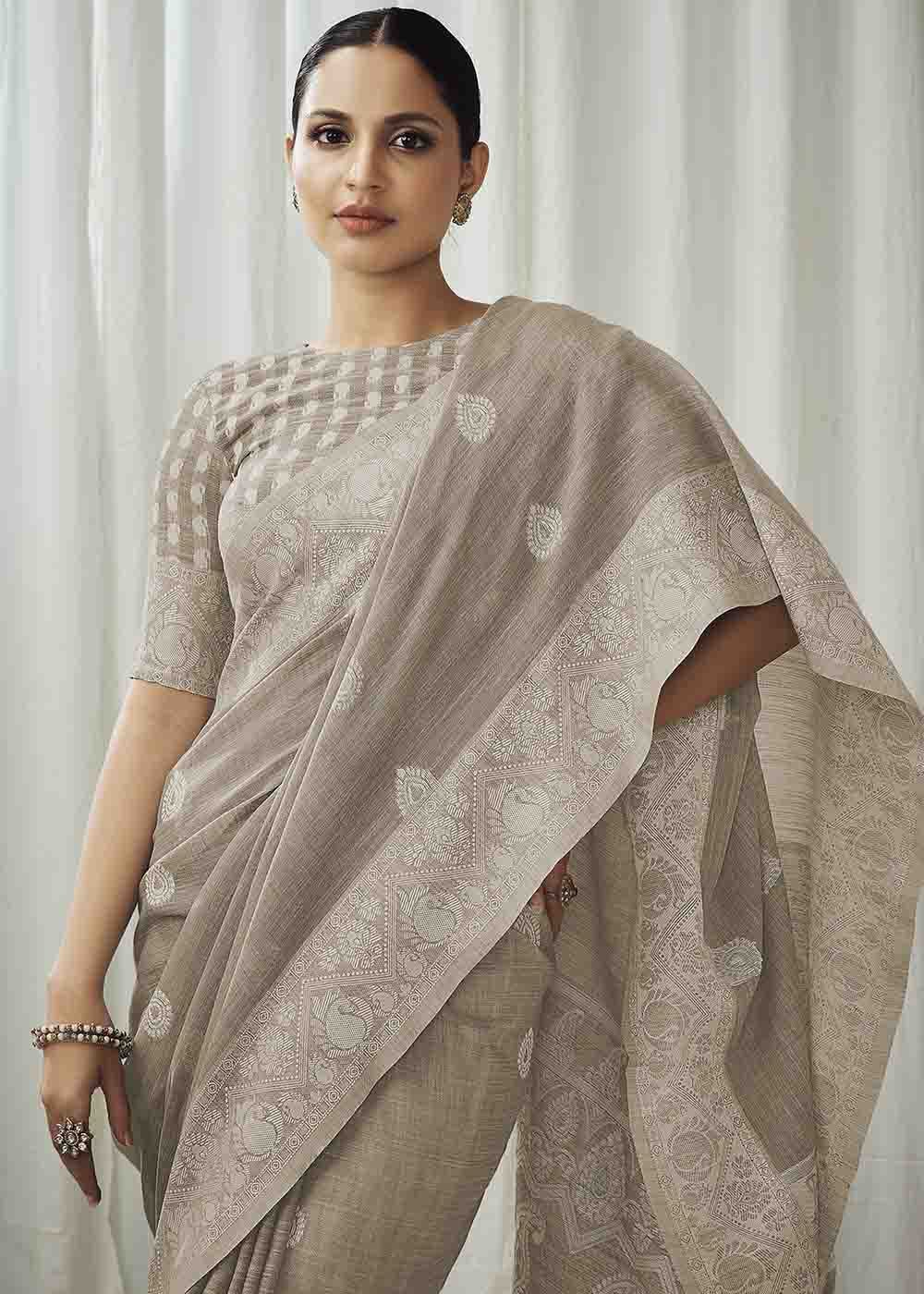 A soothing medley of glam and comfort, this Thunder Grey Woven Chikankari Linen Saree oozes elegance and class. A perfect pic for work and leisure, this comes beautified with traditional white thread Chikankari weaving to beat the summer blues. Choose this and gift yourself a spirited and breathable craft.
