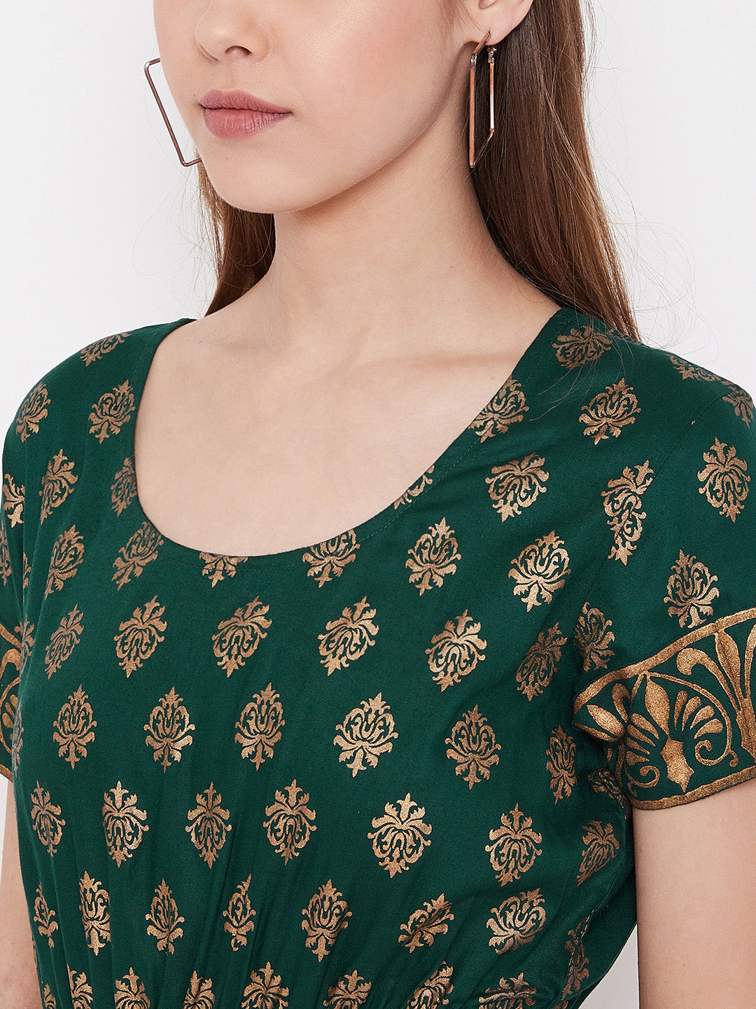 Amp-up your festive look with this metallic print Fusion dress. The set features gorgeous metallic print all-over, making it a festive must-buy. Style this with a pair of heels and gold danglers to complete the look.